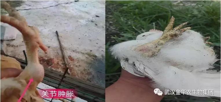 劉姐開始用替米考星加上鹽酸多西環(huán)素用了10天,效果不理想,后來加了4天強力霉素和泰勒菌素,癥狀減輕但是腫脹依舊明顯,出現(xiàn)了越來越多的癱雞,極度消瘦,精神沉郁的病雞。劉姐晚上翻來覆去睡不著,翻閱網(wǎng)上各種資料,后來看到有一個產品叫滑囊藍金”方案還不錯,就抱著試試的態(tài)度在網(wǎng)上找到了華中農業(yè)大學校企合作單位---武漢金華農生物科技有限公司,禽病技術專家姚教授、趙教授確診為滑液囊支原體后推薦劉姐使用滑囊藍金”方案。連用7天一療程。
