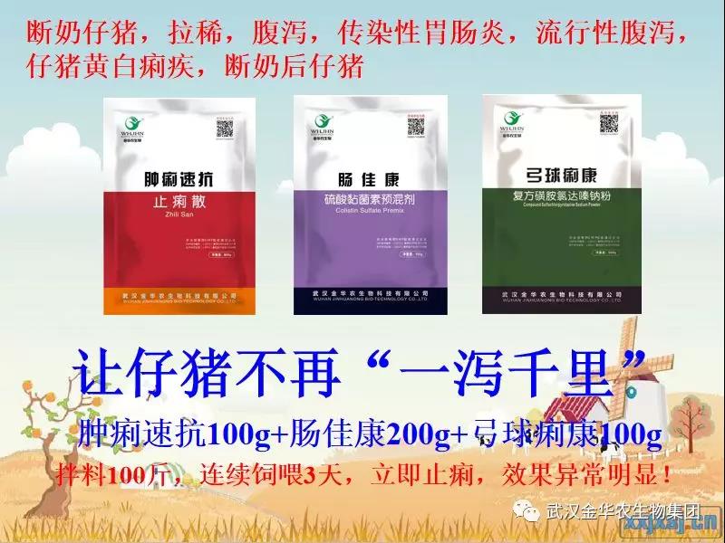 產(chǎn)床上仔豬:拉稀,黃白痢,腸炎,腹瀉,母豬喂藥,過(guò)奶止痢:腫痢速抗50g+腸佳康20g+弓球痢康15g,拌料3斤,母豬一頓吃完,早晚各一次,連續(xù)飼喂3天,產(chǎn)床仔豬立即止痢,效果異常明顯!
