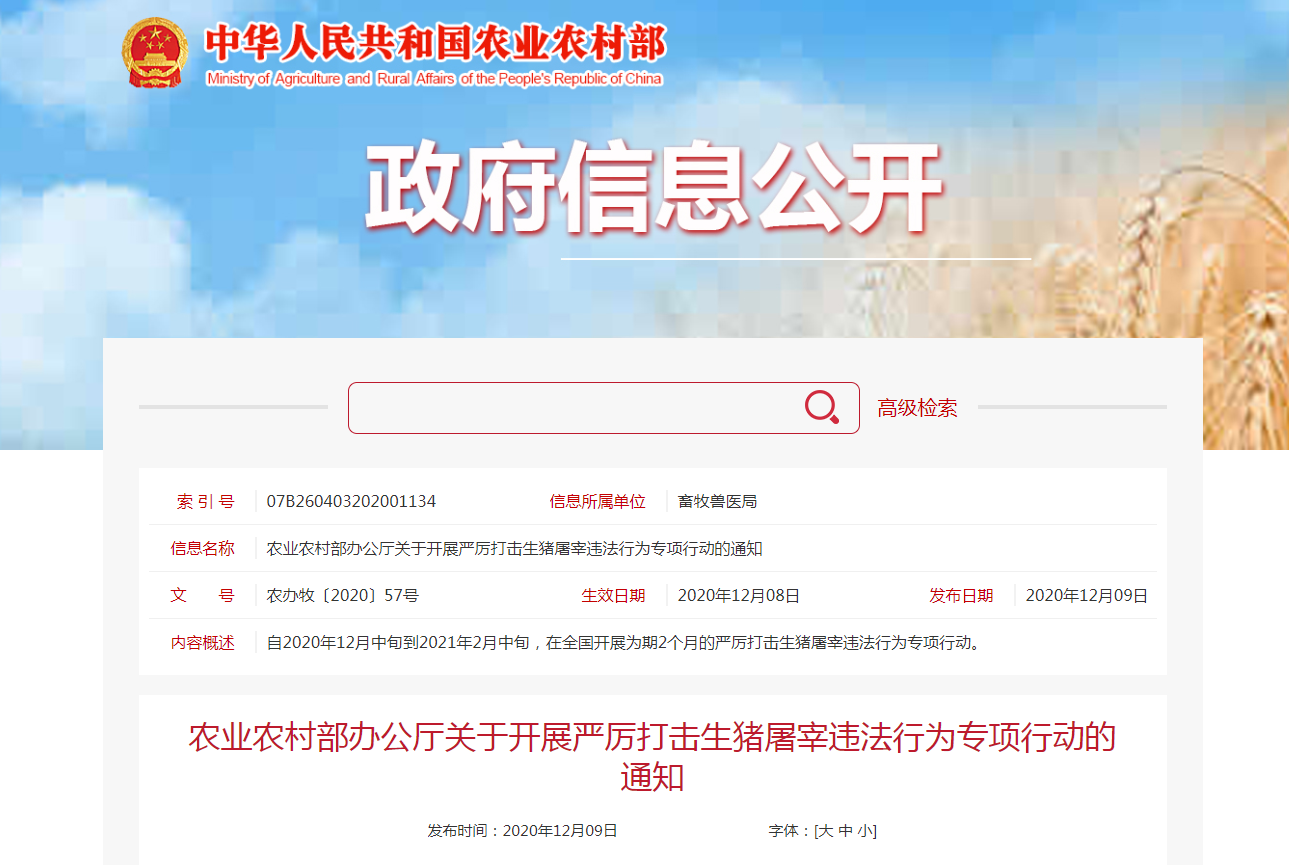 今年以來,各地通過開展農(nóng)產(chǎn)品質(zhì)量安全專項整治“利劍”行動,查辦了一批屠宰環(huán)節(jié)違法案件、搗毀了一批私屠濫宰窩點、銷毀了一批問題產(chǎn)品,有力支持了全國非洲豬瘟防控和生豬生產(chǎn)恢復(fù),有效保障了生豬產(chǎn)品質(zhì)量安全。隨著冬季,特別是元旦春節(jié)消費(fèi)旺季的到來,豬肉產(chǎn)品消費(fèi)將進(jìn)入高峰期,從近期各地案件查辦情況看,私屠濫宰等屠宰環(huán)節(jié)違法案件呈上升趨勢。為切實維護(hù)生豬屠宰行業(yè)秩序,保證生豬產(chǎn)品質(zhì)量安全,保障節(jié)日期間豬肉消費(fèi)安全和人民身體健康,農(nóng)業(yè)農(nóng)村部決定自2020年12月中旬到2021年2月中旬,在全國開展為期2個月的嚴(yán)厲打擊生豬屠宰違法行為專項行動。現(xiàn)就有關(guān)事項通知如下。