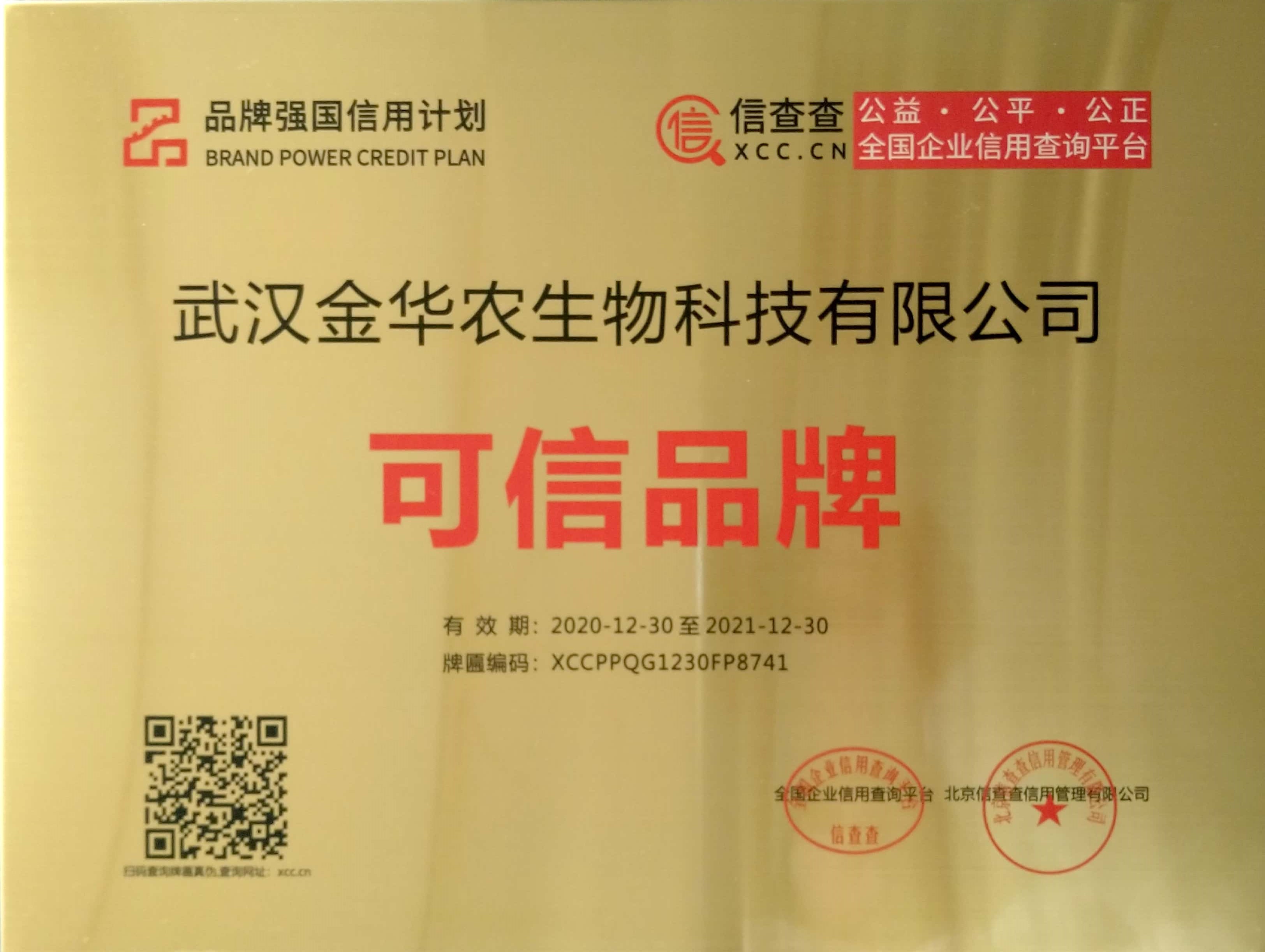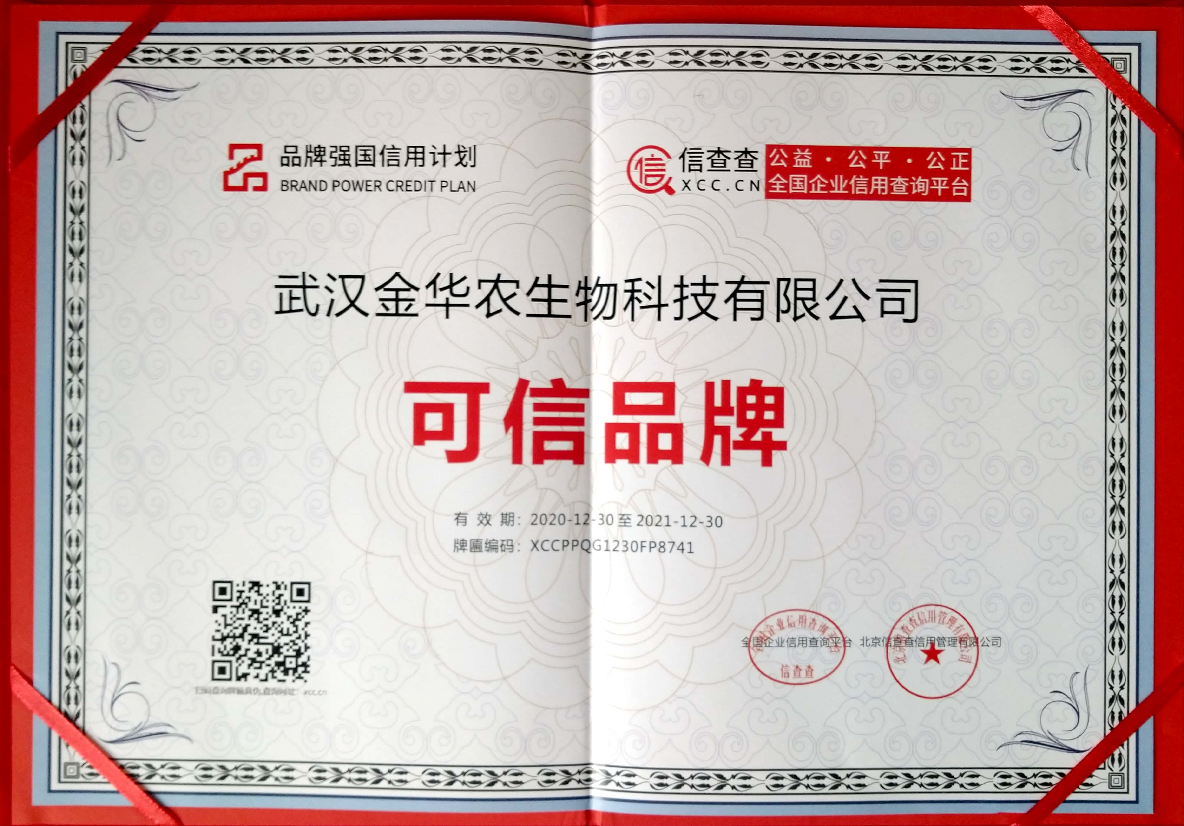 2021年1月11日,新年伊始,萬(wàn)象更新,奮發(fā)圖強(qiáng),再接再勵(lì)!武漢金華農(nóng)生物也迎來(lái)新年諸多利好消息,新年第一個(gè)月“元月份”業(yè)績(jī)突飛猛進(jìn),銷量翻番;公司新研發(fā)的新產(chǎn)品配方陸續(xù)完成基礎(chǔ)工作,國(guó)家申報(bào)工作也進(jìn)一步推進(jìn);公司憑借長(zhǎng)期以來(lái)誠(chéng)信為本、誠(chéng)信經(jīng)營(yíng)、重合同守信譽(yù),產(chǎn)品質(zhì)量第一,技術(shù)服務(wù)第一的經(jīng)營(yíng)理念,在社會(huì)發(fā)展、助農(nóng)扶貧、抗擊疫情等領(lǐng)域的持續(xù)投入和杰出表現(xiàn),同時(shí)保證經(jīng)營(yíng)狀態(tài)正常良好,無(wú)失信紀(jì)錄、無(wú)違法、無(wú)負(fù)面輿情等條件,被國(guó)家信用平臺(tái)、品牌強(qiáng)國(guó)計(jì)劃評(píng)選為“可信品牌”,并被授予“中國(guó)可信品牌企業(yè)”榮譽(yù)稱號(hào),在北京隆重舉行視頻授予儀式,新年之初,獲得新的榮譽(yù),開(kāi)啟新發(fā)展!