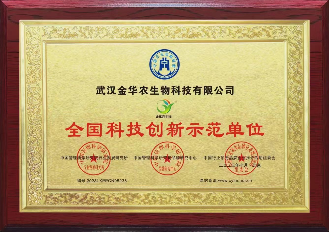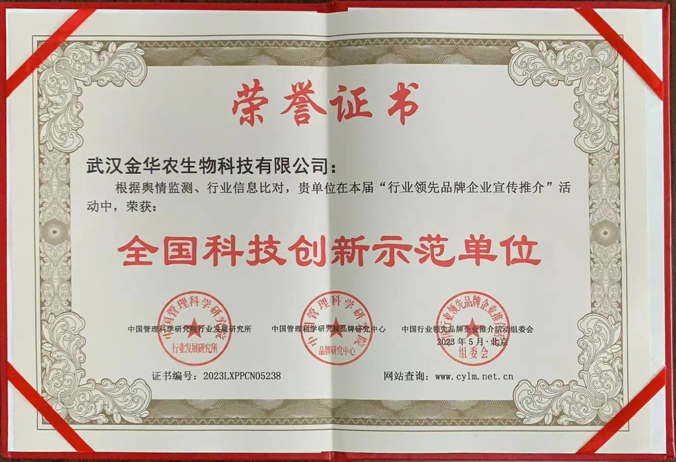 近日,中國科學研究院行業(yè)發(fā)展研究所、中國科學研究院品牌研究中心、中國行業(yè)領先品牌企業(yè)推介活動組委會等多家單位聯(lián)合舉辦了“行業(yè)領先品牌宣傳推介”活動,武漢金華農(nóng)被評為“全國科技創(chuàng)新示范單位”。這是繼國家科學技術部頒發(fā)我司“湖北省科技創(chuàng)新型企業(yè)”榮譽后的又一次榮譽表彰。
