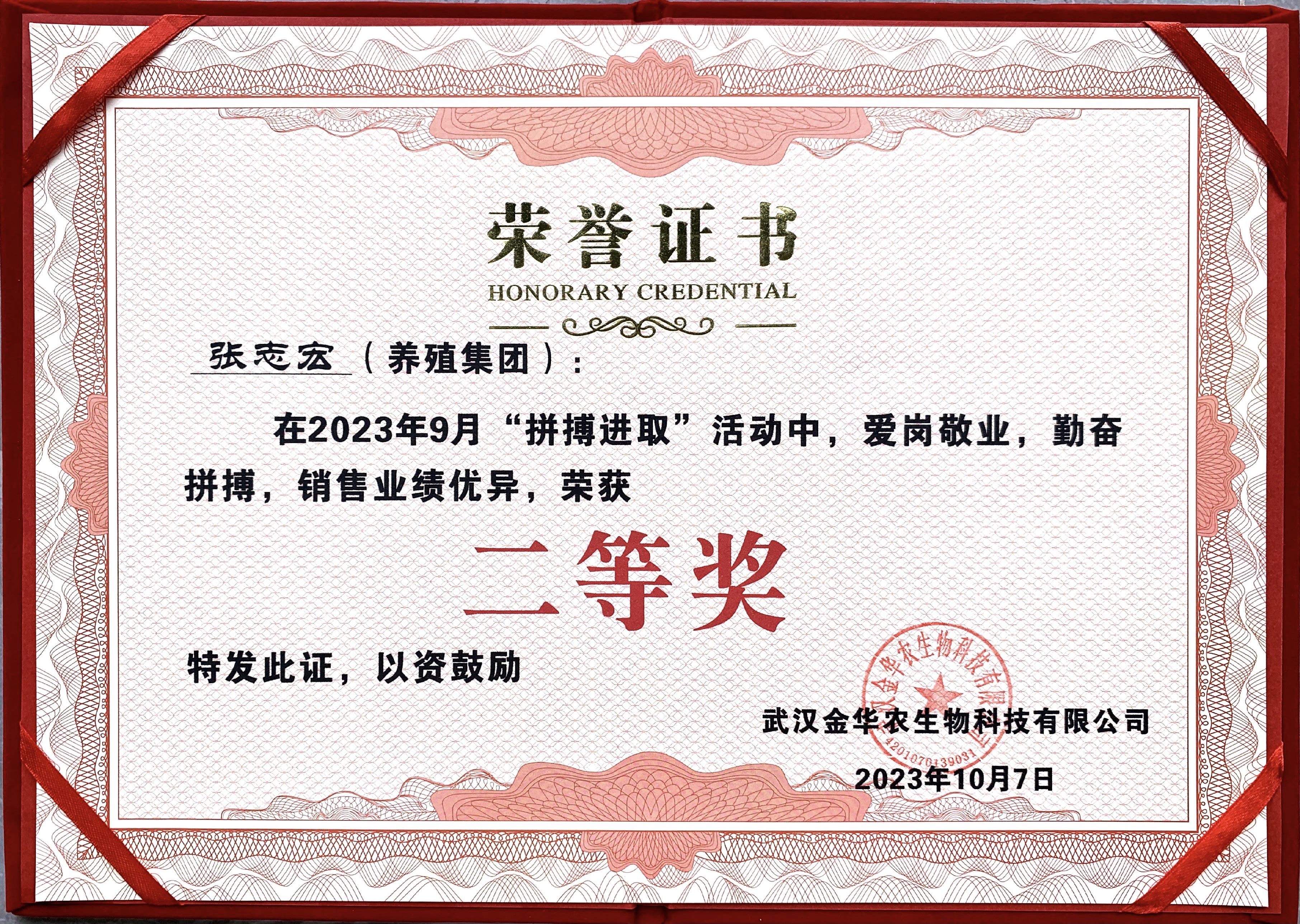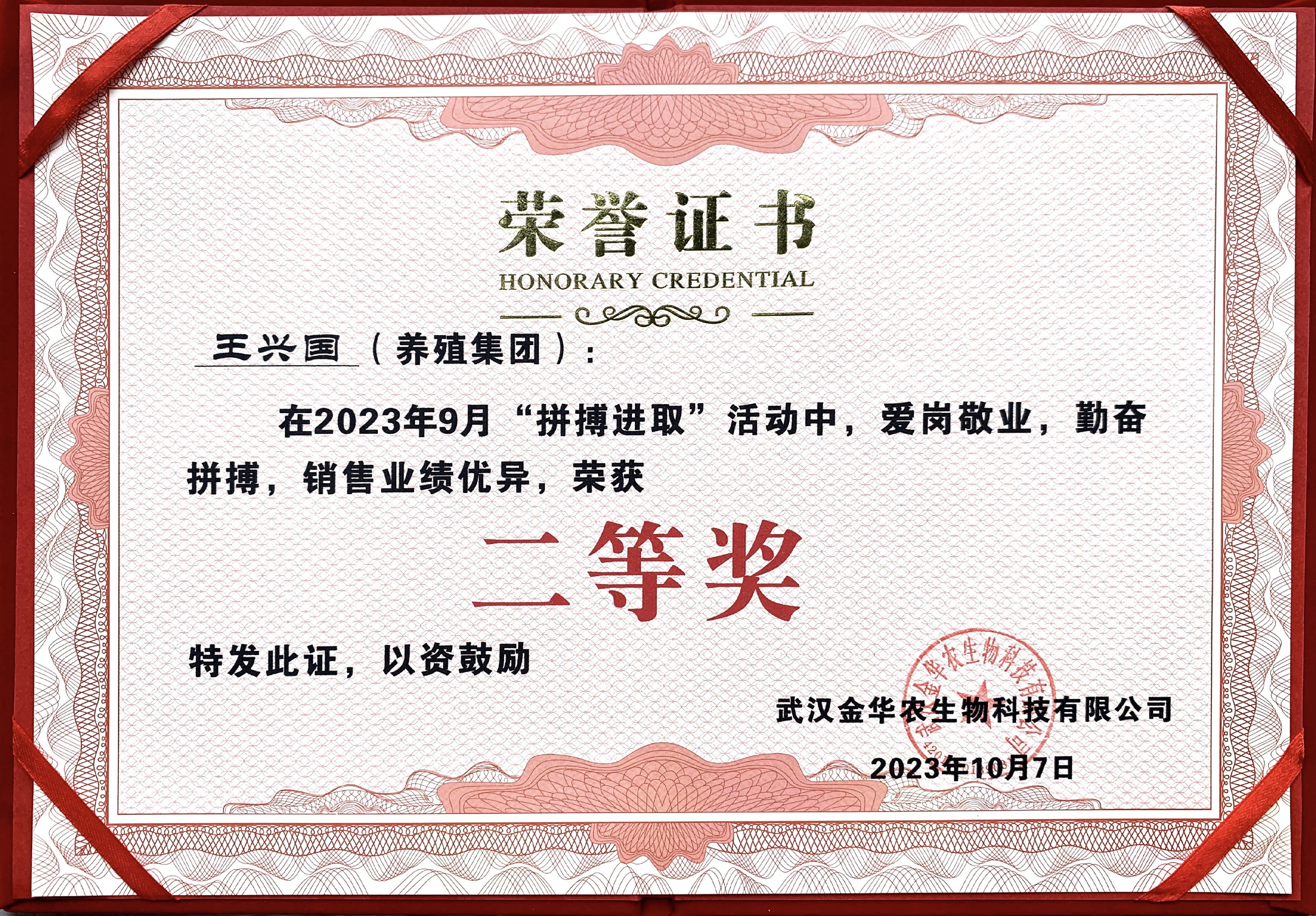 祝賀集團(tuán)化養(yǎng)殖客戶王興國經(jīng)理在2023年“拼搏進(jìn)取”活動中榮獲二等獎,2023業(yè)績有望突破400萬!尚誠合作,留勝千里,松枝掛劍。一筆筆訂單代表的不止是買賣,更是我們之間無價的情誼,你無需多言的信任,我一如既往的真誠,愿我們一單又一單,繼續(xù)陪伴。