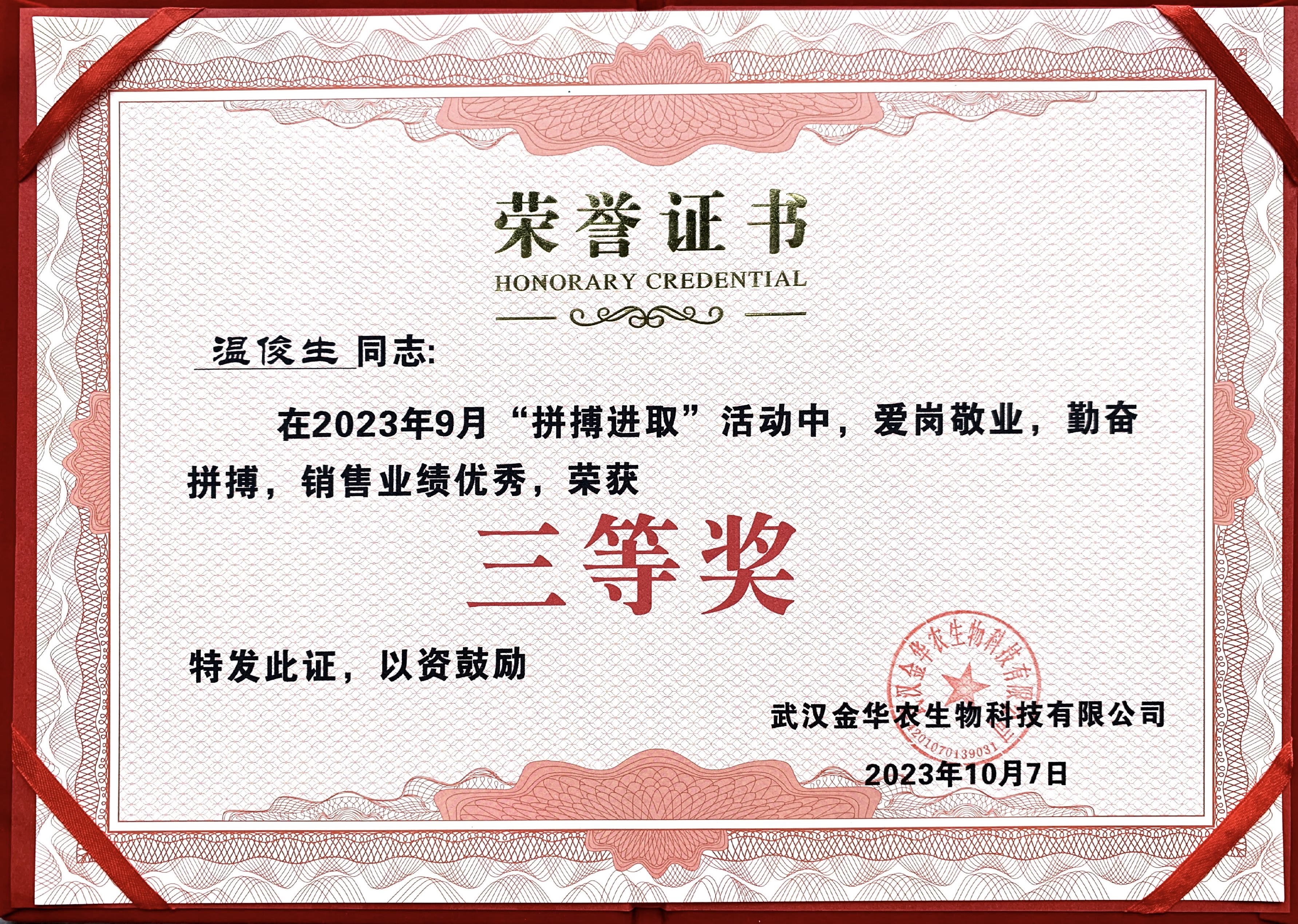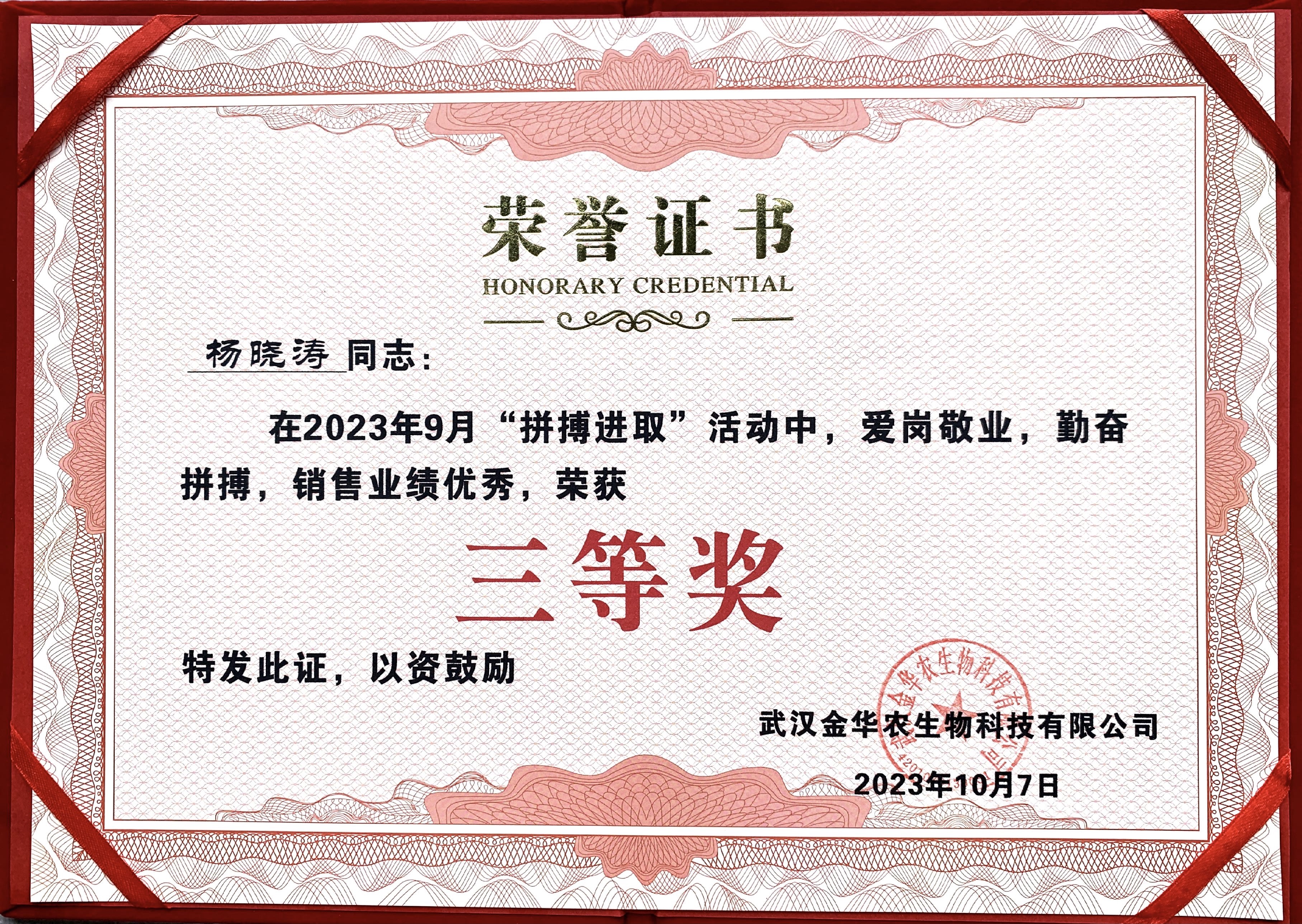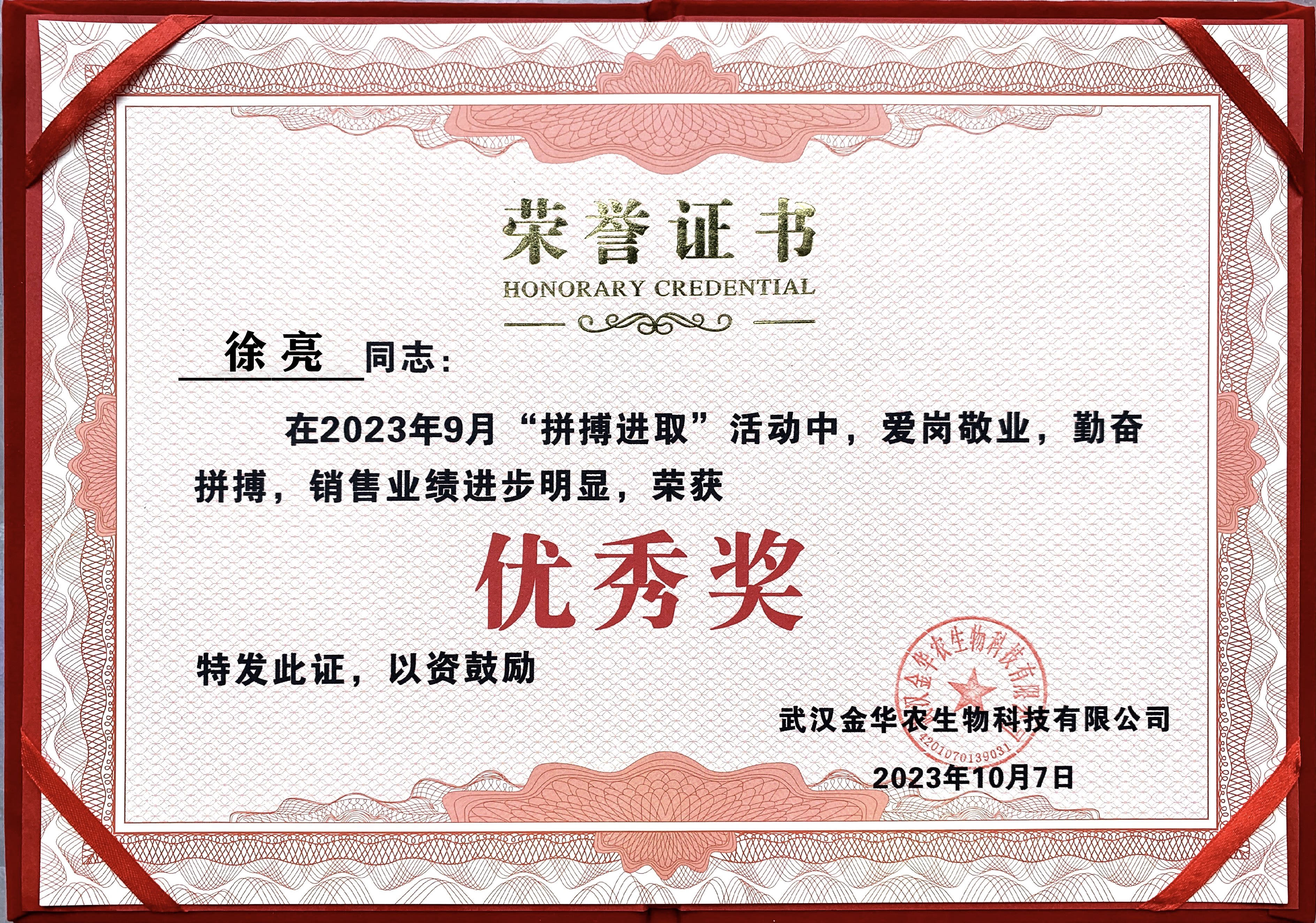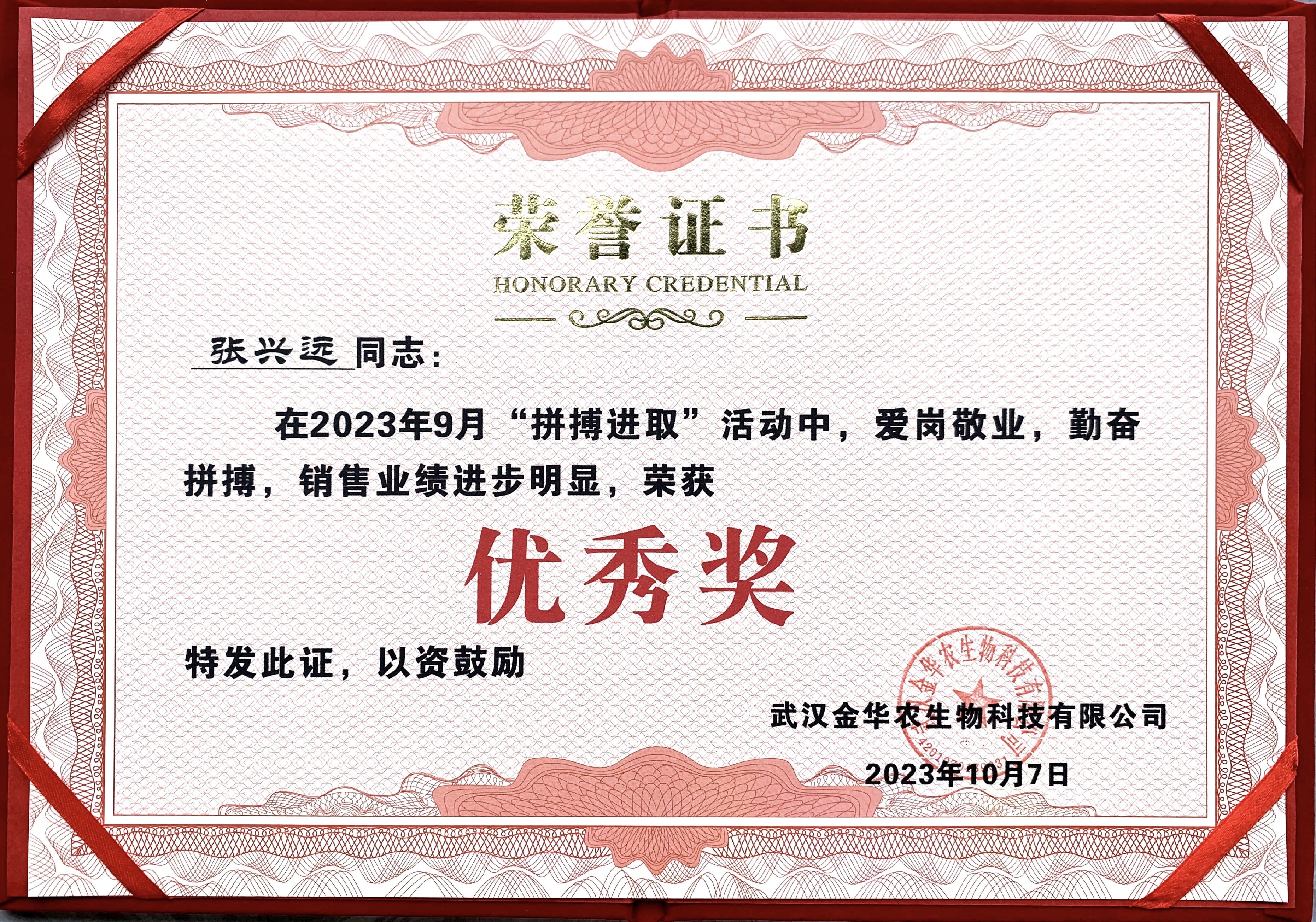 祝賀河南市場楊曉濤經(jīng)理在2023年“拼搏進(jìn)取”活動中榮獲三等獎。他從不計較個人得失,從無怨言,辛勤耕耘,默默奉獻(xiàn),用實際行動履行自己的工作,把工作當(dāng)成使命,把優(yōu)秀當(dāng)成追求,以最高的標(biāo)準(zhǔn)展現(xiàn)自己的人生價值。為武漢金華農(nóng)的發(fā)展做出了自己應(yīng)有的貢獻(xiàn)。