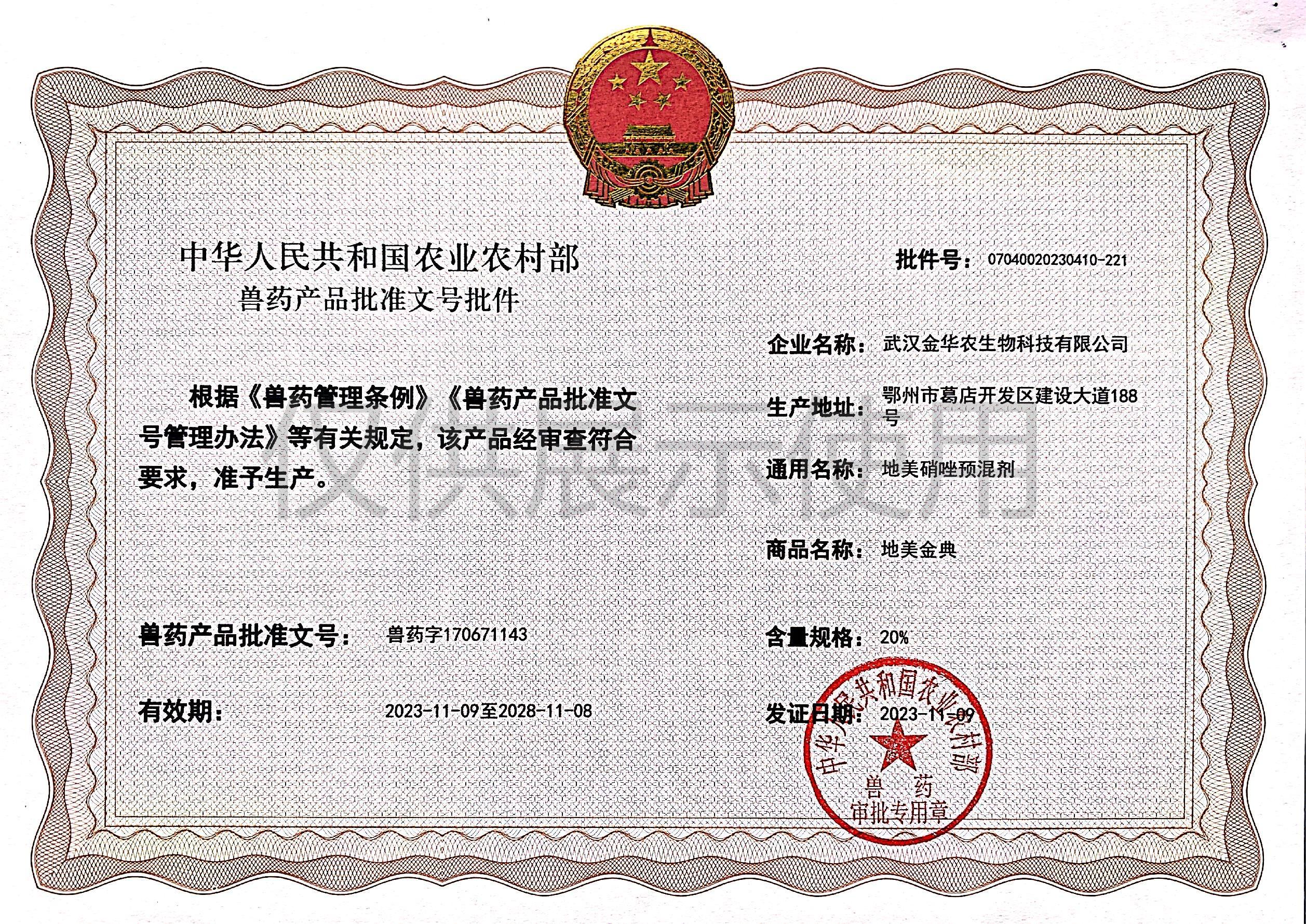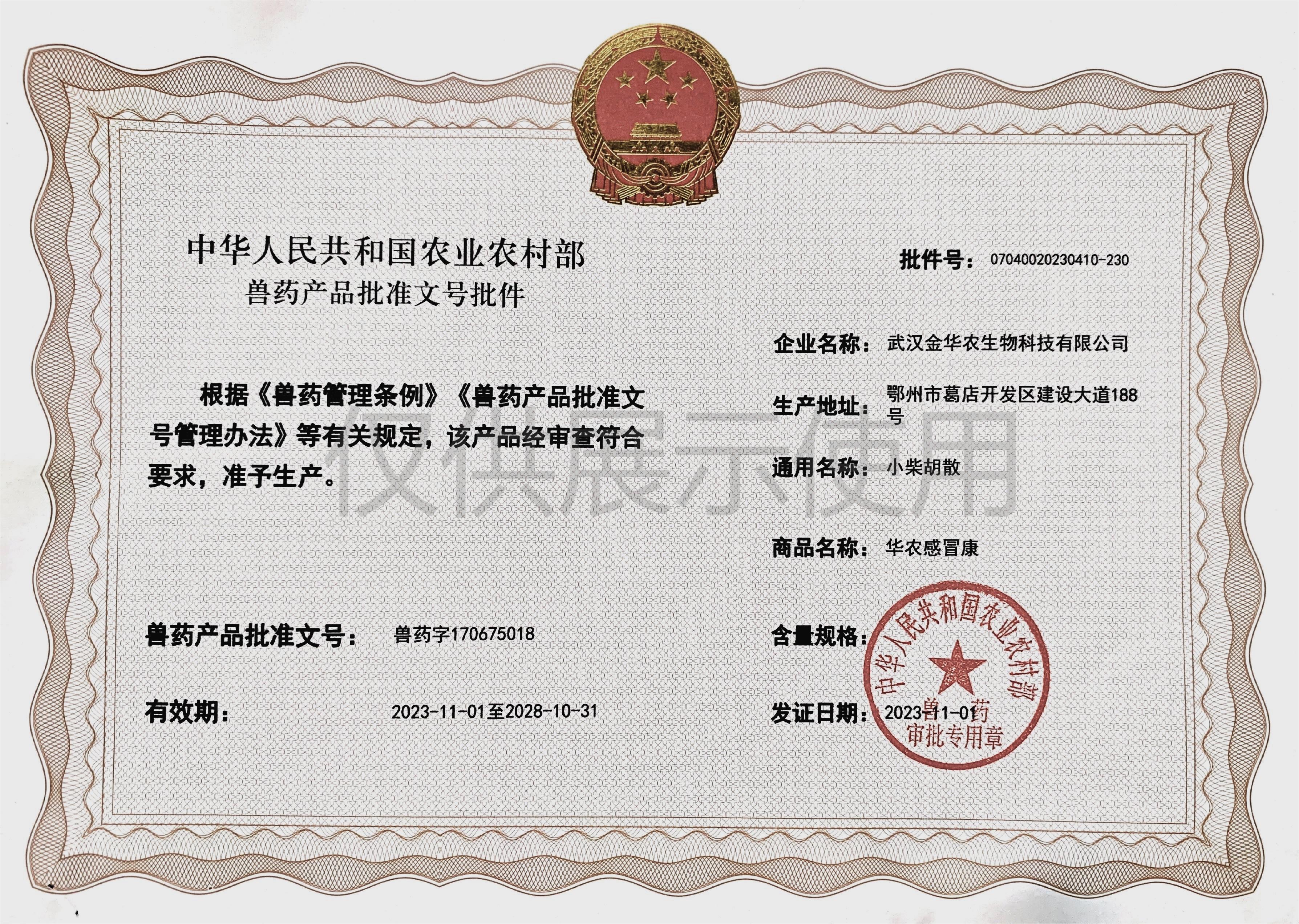 ? ? ??根據(jù)《獸藥管理?xiàng)l例》和《獸藥產(chǎn)品批準(zhǔn)文號(hào)管理辦法》的規(guī)定,經(jīng)農(nóng)業(yè)農(nóng)村部審查,準(zhǔn)予核發(fā)武漢金華農(nóng)生物科技有限公司2個(gè)新版GMP獸藥相關(guān)產(chǎn)品批準(zhǔn)文號(hào)。