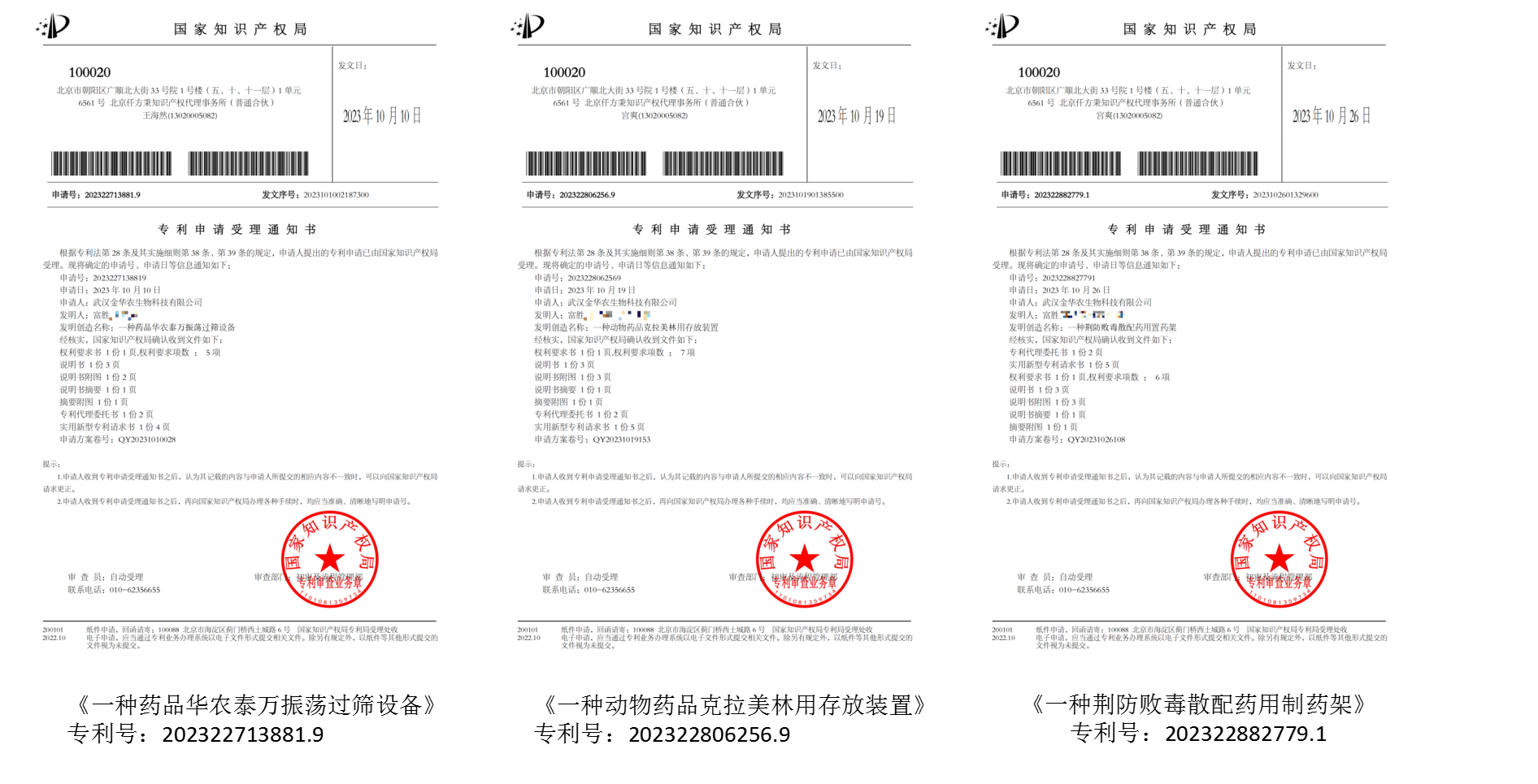 公司一共申報(bào)了9個(gè)科技發(fā)明專利。此次申報(bào)的專利產(chǎn)品深受養(yǎng)殖戶老板的喜愛,獸藥產(chǎn)品“球蟲立清、小柴胡散、華農(nóng)利可欣、華農(nóng)泰萬、克拉美林、荊防敗毒散、華農(nóng)超諾、地美金典、附優(yōu)金樂”等口碑良好,贏得市場(chǎng)一致好評(píng)。