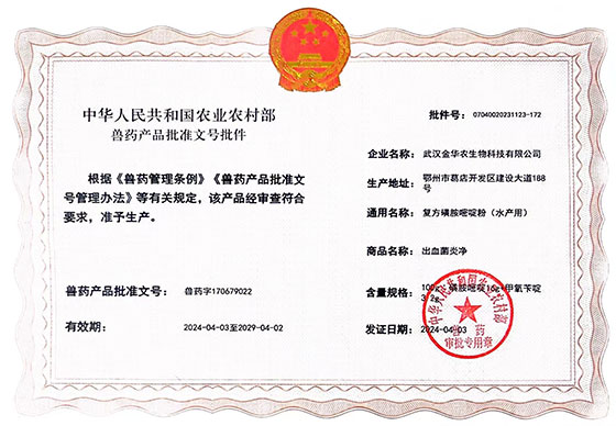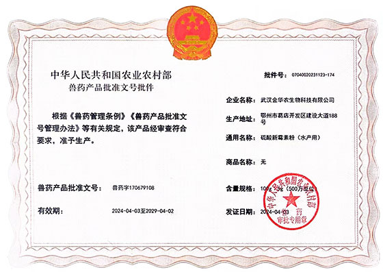 ? ? ??根據《獸藥管理條例》和《獸藥產品批準文號管理辦法》的規(guī)定,經農業(yè)農村部審查,準予核發(fā)武漢金華農生物科技有限公司3個新版GMP水產漁藥相關產品批準文號。