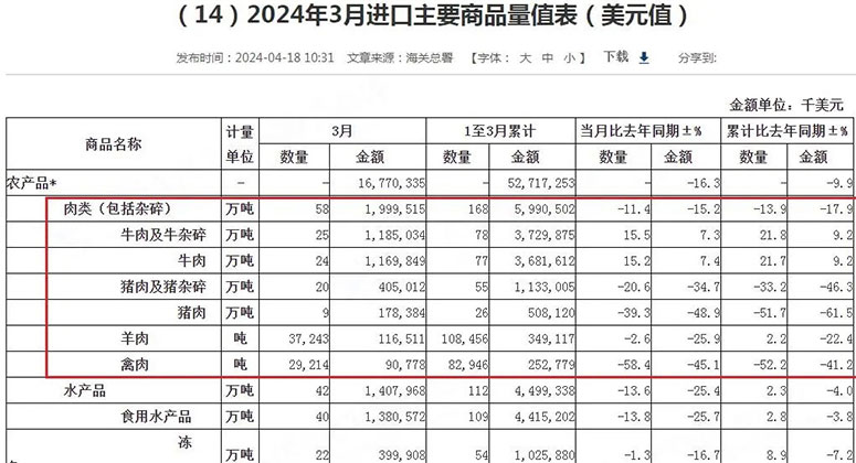 4月18日,海關(guān)總署發(fā)布最新數(shù)據(jù),2024年3月中國進口肉類(包含雜碎)58萬噸,同比下降11.4%;總進口金額為142.1億人民幣,同比下降11.6%。