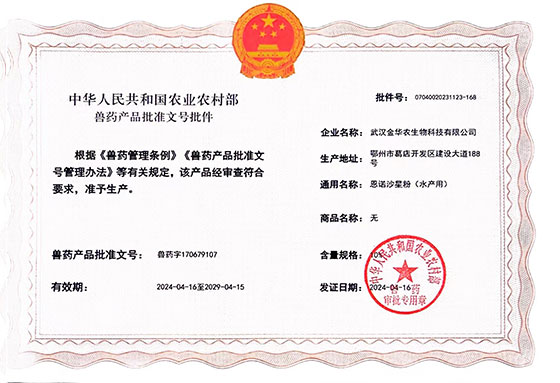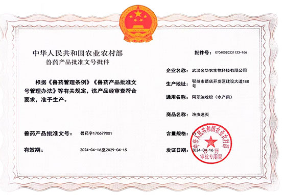 ? ? ??根據(jù)《獸藥管理條例》和《獸藥產(chǎn)品批準文號管理辦法》的規(guī)定,經(jīng)農(nóng)業(yè)農(nóng)村部審查,準予核發(fā)武漢金華農(nóng)生物科技有限公司2個新版GMP水產(chǎn)漁藥相關產(chǎn)品批準文號。