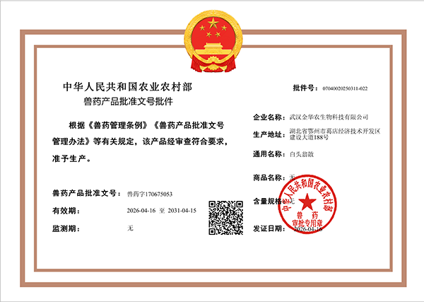 ? ? ? 根據(jù)《獸藥管理?xiàng)l例》和《獸藥產(chǎn)品批準(zhǔn)文號管理辦法》的規(guī)定,近日,經(jīng)農(nóng)業(yè)農(nóng)村部審查,準(zhǔn)予核發(fā)武漢金華農(nóng)生物科技有限公司3個新版GMP獸藥相關(guān)產(chǎn)品批準(zhǔn)文號。