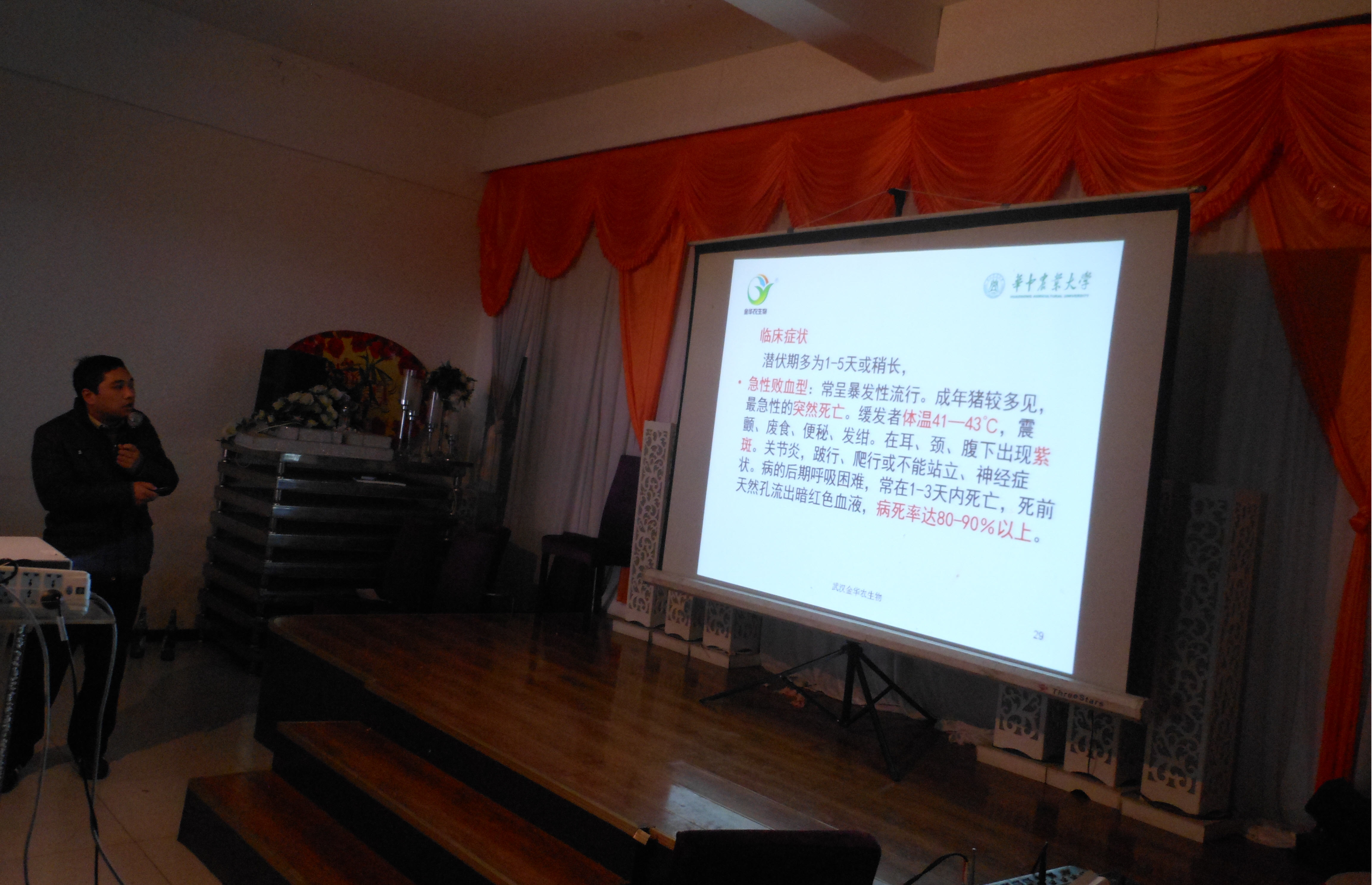 此次會議主要涉及到豬口蹄疫、喘氣病、傳染性胸膜肺炎、豬傳染性胃腸炎、仔豬黃痢疾、白痢疾等冬季易發(fā)病。胡老師針對每種疾病的癥狀進(jìn)行詳細(xì)講解,并用淺顯易懂的語言回答現(xiàn)場養(yǎng)殖戶的疑問,有效的互動讓整個會議氣氛熱烈而輕松。