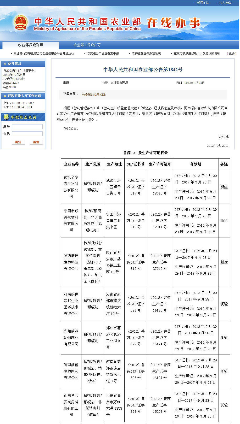 農業(yè)部1842號公告:武漢金華農榮獲獸藥研發(fā)生產資質