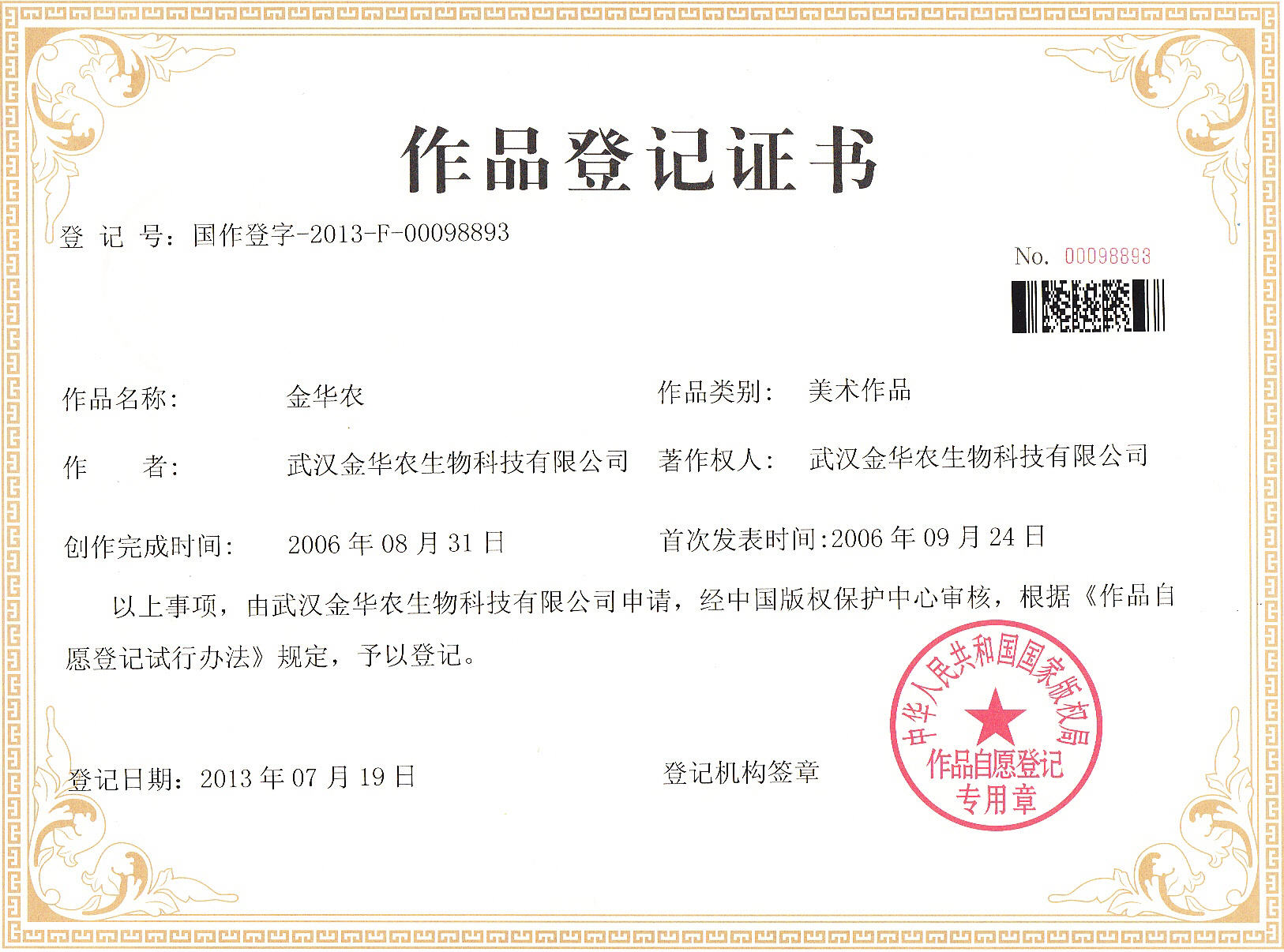 ? ? ? ?8月15日,公司正式收到由國(guó)家版權(quán)局榮譽(yù)頒發(fā)的《金華農(nóng)版權(quán)登記證書》,這標(biāo)志著公司品牌得到國(guó)家權(quán)威部門的法律保護(hù)。在動(dòng)保獸藥、飼料添加劑領(lǐng)域,“金華農(nóng)”商標(biāo)及版權(quán),均歸屬于武漢金華農(nóng)生物科技有限公司所有。其他公司所涉及的“金華農(nóng)”產(chǎn)品均屬于假冒、仿冒和侵權(quán),本公司將保留追究其法律責(zé)任的權(quán)利 ?!敖鹑A農(nóng)”品牌的版權(quán)保護(hù),將進(jìn)一步鞏固武漢金華農(nóng)生物科技有限公司在國(guó)內(nèi)外獸藥、飼料添加劑等動(dòng)保產(chǎn)品的市場(chǎng)地位、榮譽(yù)和知名度,將強(qiáng)有力的掃除公司在市場(chǎng)上快速發(fā)展的障礙,將使公司整體“一三五”戰(zhàn)略規(guī)劃向前急速推進(jìn)!