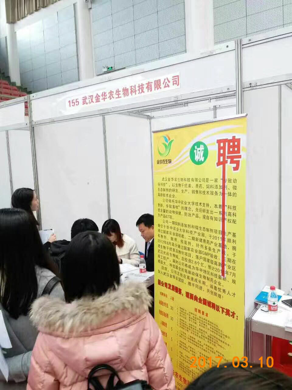 3月10日,武漢金華農(nóng)生物應(yīng)邀參加華中農(nóng)業(yè)大學(xué)春季畢業(yè)生供需見面會(huì)。隨著公司規(guī)模進(jìn)一步擴(kuò)大,發(fā)展步伐進(jìn)一步加快,原有規(guī)模不能滿足公司發(fā)展,增設(shè)部門和擴(kuò)充人手勢(shì)在必行。武漢金華農(nóng)提供的多個(gè)崗位受到華農(nóng)學(xué)子的熱烈追捧,爭(zhēng)先恐后前來咨詢和面試,競(jìng)聘各種崗位。經(jīng)過現(xiàn)場(chǎng)面試和篩選,公司在本次招聘會(huì)上收獲人才頗豐!