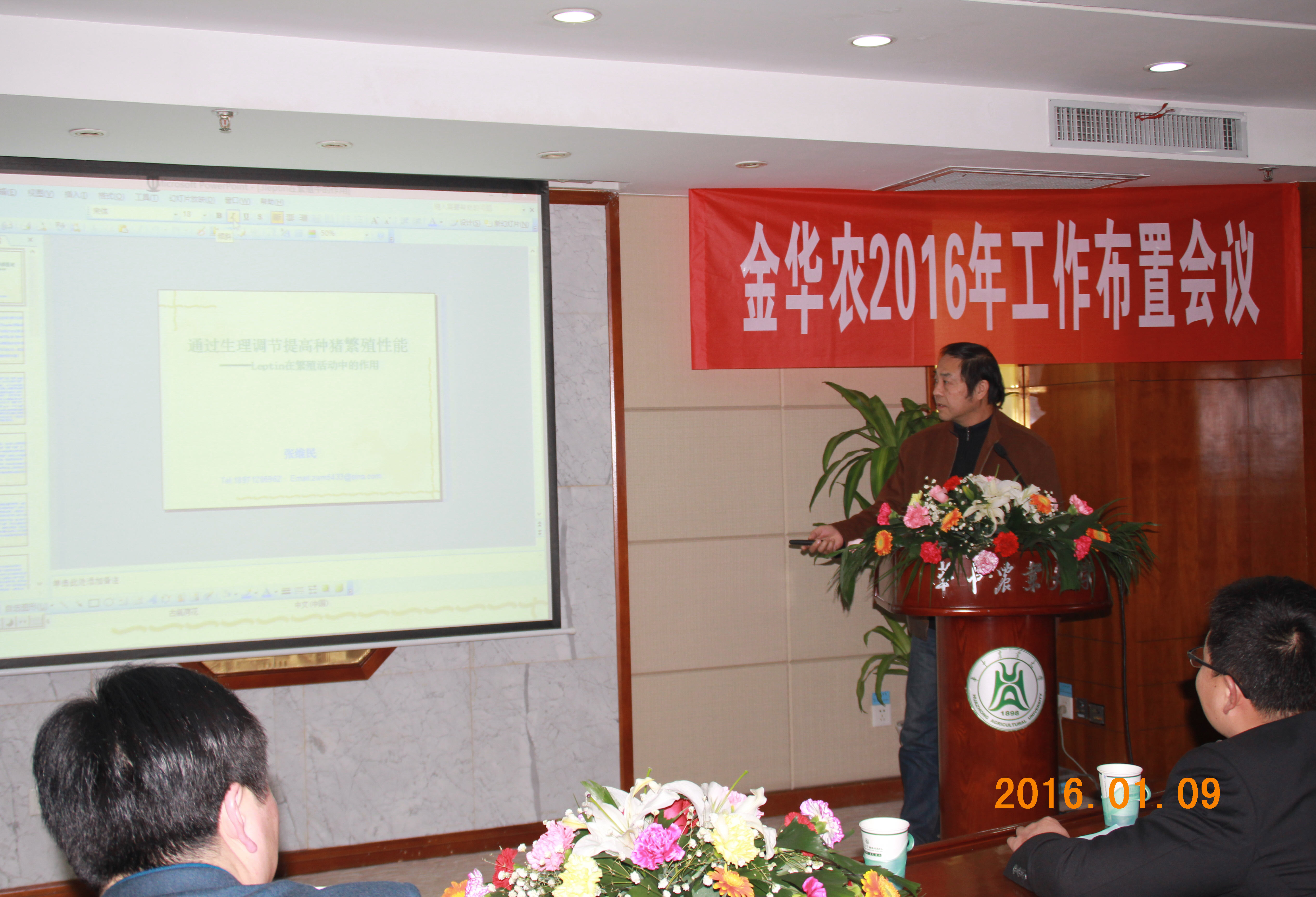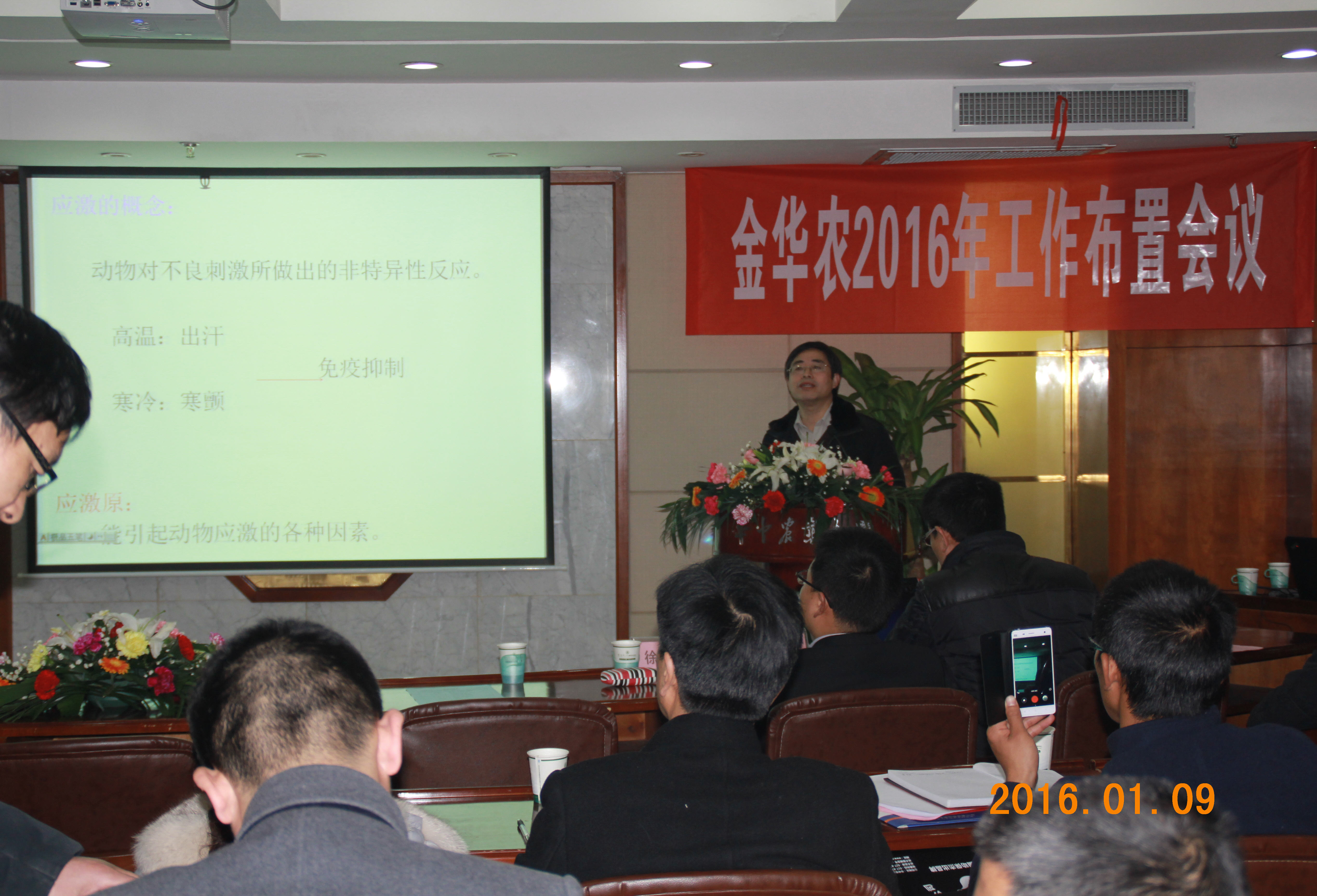 齊德生教授講課中說:我今天很高興又一次參加武漢金華農(nóng)生物科技有限公司年終工作會議,其實(shí)很早金華農(nóng)公司建廠飼料添加劑驗(yàn)收時,我就參加專家組的驗(yàn)收工作,與富總十分熟悉。希望今天的講課內(nèi)容“冬季呼吸道、霉菌毒素、仔豬拉稀”都是常見疾病,能與大家分享,并且有所幫助!我感受到了金華農(nóng)公司在富總的帶領(lǐng)下每年都有很大的變化和不一樣,與時俱進(jìn),總在科研前沿,祝福金華農(nóng)公司、祝福金華農(nóng)團(tuán)隊(duì),提前完成2016既定目標(biāo)!
