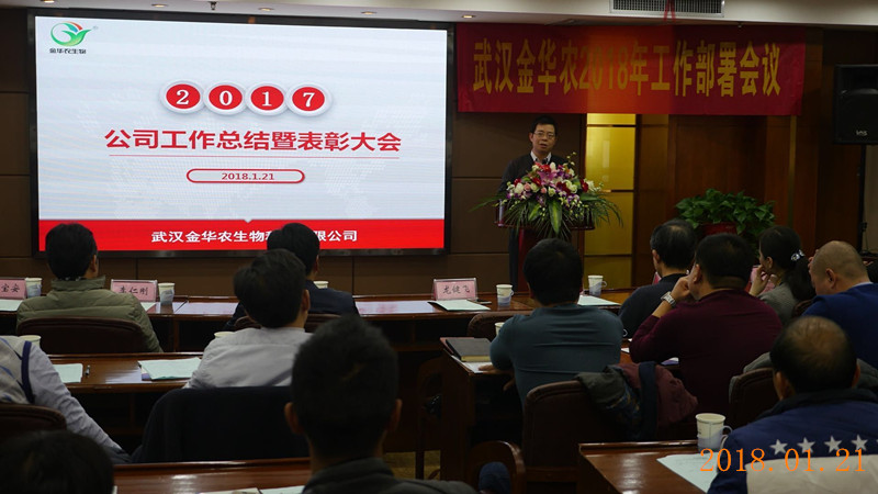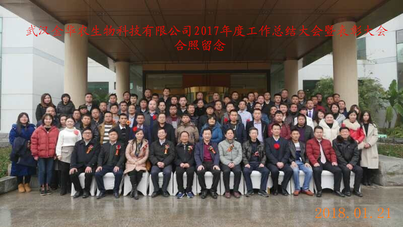 2018年1月20日~24日,武漢金華農生物科技有限公司2017年度工作總結暨表彰大會,在華中農業(yè)大學隆重勝利召開,學校、院系領導、博士生導師、教授專家、公司高層、全國21個省市的精英代表齊聚盛會,百人團隊學習交流、總結經驗、表彰先進、規(guī)劃未來。